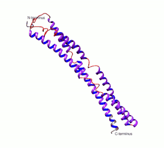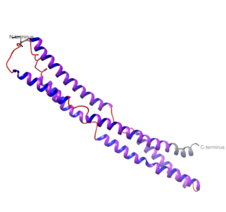 The protein product is predicted to have multiple α-helices, coiled coil, and one β-sheet. It is suggested that the protein does not contain transmembrane regions or helices, meaning that the protein is not anchored to the cell membrane nor an intracellular membrane like the Golgi apparatus.[14]