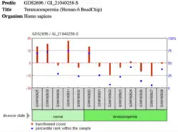 Data from an experiment also indicated noticeably lower expression of the gene in sperm affected with teratozoospermia, a condition where sperm have abnormal morphology affecting the fertility in males, compared to normal sperm.[22]
