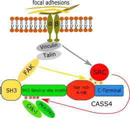 All CAS protein family members have common structural characteristics.[6] CAS proteins have an amino terminal SH3 domain enabling interaction with poly-proline motif-containing proteins such as FAK. Carboxy-terminal to this, they possess an unstructured domain containing multiple SH2 binding site motifs, which when tyrosine-phosphorylated allow interaction with SH2 domain containing proteins. Further to the carboxy-terminus, they have a four-helix bundle rich in serine residues, and a second highly conserved four-helix bundle that has been recognized as functionally and structurally similar to a focal adhesion targeting [FAT] domain.[8] For the better studied members of the CAS family (BCAR1 and NEDD9), all of these domains have been defined as crucial for recognition and binding by other proteins, reflecting the primary role of CAS family proteins as cell signaling cascades mediators.