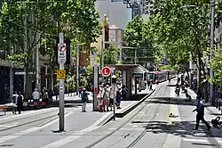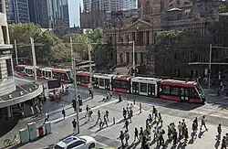The section between Town Hall and Circular Quay is wire-free, with trams using Alstom's proprietary APS technology to run instead.[19] This was originally to have been achieved by equipping the trams with batteries and providing recharging facilities at stops.