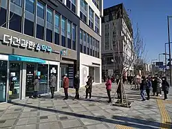 On 20 February, the streets of Daegu were empty in reaction to the Shincheonji outbreak. A resident described the reaction, stating "It's like someone dropped a bomb in the middle of the city. It looks like a zombie apocalypse."[5] The first death was reported[48] in a mental ward of Cheongdo Daenam Hospital in Cheongdo County. According to the mayor of Daegu, the number of suspected cases as of 21 February was 544 among 4,400 examined followers of the church.[49] The hospital was suspected as the source of the present outbreak after it was visited by a woman who became the second fatal case of South Korea on that day. Upon investigation, it was determined that the infection had spread to that hospital through a funeral ceremony attended by members of the church.[50][51]