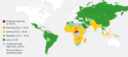 An asterisk (*) indicates that country is considered to be an "extreme hunger" hotspot by Oxfam,[1] as indicated in the July 2020 Oxfam report. These ten key areas of "extreme hunger" that account for 65% of the total population facing crisis-level hunger (IPC phase 3 or above) include Afghanistan, DR Congo, Ethiopia, Haiti, South Sudan, Sudan, Syria, Venezuela, Yemen and the West African Sahel (including Burkina Faso, Chad, Mali, Mauritania, Niger, Nigeria and Senegal).[1][2] It also noted "emerging epicentres" of hunger, alongside famine-stricken areas, in Brazil, India, Yemen, South Africa and the Sahel.[1][2] The United Nations has made an "urgent call" to improve data analytics in several countries which may be at risk, including Congo, North Korea, Eritrea, Kyrgyzstan, Nepal, Philippines and Sri Lanka.[41]