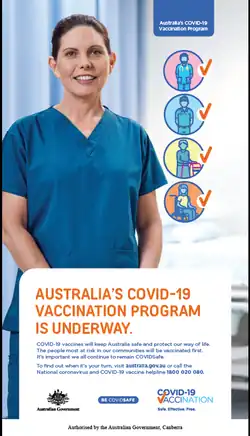 The general COVID-19 vaccination in Australia program began on 22 February 2021 in response to the COVID-19 pandemic, with the goal of vaccinating all willing people in Australia before 2022. Front-line workers[a] and aged care staff and residents had priority for being inoculated, before a gradual phased release to less-vulnerable and lower-risk population groups throughout 2021. The Therapeutic Goods Administration (TGA) approved four vaccines for Australian use in 2021: the Pfizer–BioNTech vaccine on 25 January, the Oxford–AstraZeneca vaccine on 16 February, Janssen vaccine on 25 June and the Moderna vaccine on 9 August.[4][5][6][7] Although approved for use, the Janssen vaccine was not included in the Australian vaccination program as of June 2021.[8]