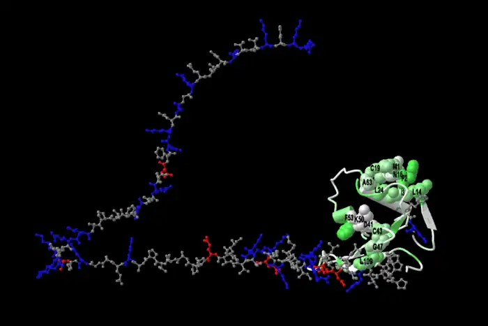 Human uncharacterized CXorf65's secondary structure is predicted to have five sections of β-sheets and four sections of α-helixesm[22] The corresponding tertiary structure is thus predicted to be a β-grasp fold[23] accompanied by a long basic (positively charged) tail.[22]