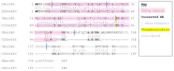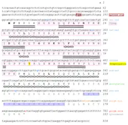 Human uncharacterized protein CXorf65 isoform X1 is an alternative splicing that results in the exclusion of exon 4, which shortens the transcript by 69 base pairs and ultimately leads to a nonfunctional protein.[15] The non-coding RNA sequence suffers from a frameshift mutation due to a 19 bp deletion in exon 2.[16] This results in a premature stop codon 126 bp from the start of translation.