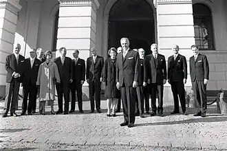 ![]() Prime Minister Borten with his cabinet on 21 October 1965 outside the Royal Palace. | |