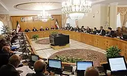 The Cabinet of Iran (Persian: هیئتدولت ایران, romanized: Heyatedovlat-e Iran) is a formal body composed of government officials, ministers, chosen and led by the President of Iran. Its composition must be approved by a vote of parliament. According to the Constitution of the Islamic Republic of Iran, a president may dismiss members of the cabinet, but must do so in writing, and new appointees must again be approved by parliament. Cabinet meetings are held weekly on Saturdays in Tehran and are chaired by the president. There may be additional meetings as circumstances require. The Supreme Leader of Iran Ali Khamenei has the power to dismiss cabinet members like ministers, vice presidents and presidents at any time, regardless of parliamentary decisions.