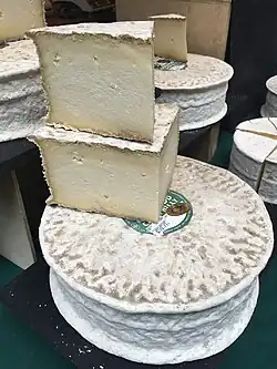 Caerphilly is a light-coloured (almost white) crumbly cheese made from cow's milk, and generally has a fat content of between 45% and 55%.[8] It has a mild taste, with a tang of lemon.[5][9] A traditional Caerphilly must be made with milk produced by Welsh farms. It can be either pasteurised or unpasteurised, and comes in both organic and non-organic varieties.[8]
