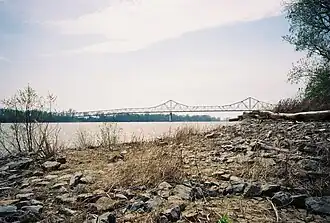 The Cairo Mississippi River Bridge is a steel truss through deck bridge carrying U.S. Route 60 and U.S. Route 62 across the Mississippi River.[1] Located in the tri-state area of Illinois, Kentucky, and Missouri, it connects Cairo, Illinois at its northern terminus to Bird's Point, Missouri at its southern terminus. The bridge measures 5,175.5 feet (1,577.5 meters) in length with a main span of 700.9 feet (213.6 meters) and a width of 20 feet (6.1 meters).[2] At its apex, the bridge stands 114 feet (35 meters) above the river with a 675-foot (206-meter) navigation channel.[1] In the years since the construction of the bridge, the town of Cairo has experienced an 81% population decline (1930 to 2010), the most dramatic decrease of any principal city in the United States.[3] The bridges initially played a part in the town's demise as the ferry and railroad industries were severely impacted.[4]