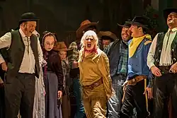 At the time of the premiere of the stage musical of Calamity Jane, Warner Bros. was considering mounting a Broadway production of the play,[17] but US performances of the stage musical of Calamity Jane have remained essentially confined to the repertory and amateur theater scene. A Broadway production announced in 2005, using a revised book by Randy Skinner, who would also direct and choreograph,[18] failed to materialize—though the prospective production held readings in New York City with C&W singer Louise Mandrell as Calamity Jane and veteran musical actor Brent Barrett as Wild Bill (Barrett had played Frank Butler opposite Reba McEntire in Annie Get Your Gun at the Marquis in 2001).[19] Louise Mandrell eventually headlined a repertory production of Calamity Jane by the Good Company Players, featuring Dan and Emily Pessano, Teddy Maldonado, Brian Pecheau, Tami Cowger, and Jacob Carrillo.[20] The production ran 19 July - 16 September 2012 at Roger Rocka's Dinner Theater in Fresno.[20] Mandrell would then twice headline one-off performances of Calamity Jane, firstly on 11 September at the Folly Theater in Kansas City MO as an event in the Arts Midwest 2015 Conference,[21] and subsequently on 11 October 2015 at the CMA Theatre as an event in the International Entertainment Buyers Association 2015 Conference.[22] The Good Company Players would encore their production of Calamity Jane at Roger Rocka's Dinner Theater July 18-September 15, 2019, with Mandrell again headlining.[23][24]