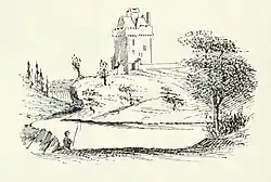Another engraving features in facsimile in Castellated and Domestic Architecture of Scotland by MacGibbon & Ross, which is based upon an original sketch described as signed "W. Binton, 1765".[3] It has been shown through examination of this sketch and similar that this actually reads "N. Britain", a reference to 'North Britain' as representing Scotland rather than a signature, and that the engraving is believed to be copied after a lost original by Sandby in addition to numerous others held by the King's topography collection at the British Library.[14] This confusion caused the drawing to be lost to those trying to find it for the past 100 years. It was rediscovered in 2015, again by Chris Ladds, and is also now held by the National Galleries of Scotland.
