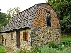 The change in roof style can be seen as a line in the brickwork on the east wall of the house.[10]: p7 The chimney of the main house was destroyed in a fire. The date is unknown and it's not clear if this was a different fire than the one that destroyed the east wing. The chimney was rebuilt at the back of the house, rather than the center, and used by two corner fireplaces, one in each room. The house was divided at this time and used by two families. The attic regions were also separate and were accessed by separate spiral staircases. The baking oven was moved outside, as it was considered a fire hazard.[10]: p7 The chimney and fireplace were later returned to their original forms and locations during restoration of the house in the 1960s.