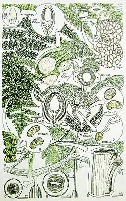 | Reconstruction of the plant Callospermarion pusillum (permineralized ovules), Idanothekion callistophytoides (pollen organ), Dicksonites pluckenetii (leaves), Callistophyton poroxyloides (stem), and Vesicaspora shaubergeri (pollen) from the Pennsylvanian Calhoun Formation of Berryville, Illinois.[1] | |