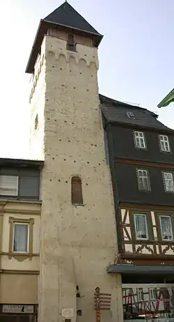 The Untertorturm is known locally as the Schiefer Turm von Bad Camberg (“Leaning Tower of Bad Camberg”), a name that owes itself to a lean of 1.44 m over a height of 21 m. On its base once stood three gates in a row. Its old cupola was destroyed in 1945 as the Second World War neared its end.