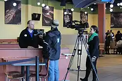 A television crew in the dining area doing an interview with staff about the current work of the aquarium.