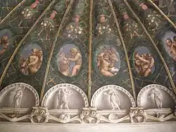 In 1524 an enclosure rule was forced on the convent, preventing male visitors, and for some two centuries the existence of the chamber's decoration remained unknown.[4] In 1774 the painter and art historian Anton Raphael Mengs analyzed the work, which thenceforth became known as an important example of late Renaissance painting in Italy. The iconography of the frescoes has been the subject of debate, and at present has not yet been conclusively explained.[5]