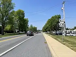 With the creation of the U.S. Highway System on November 11, 1926, US 230, a spur of US 30, was designated to run from US 22/PA 3/PA 13 at Mulberry and Cameron streets in Harrisburg southeast to US 1 east of Conowingo, Maryland. The route headed southeast from Harrisburg through Middletown, Elizabethtown, and Mount Joy to Lancaster, where it turned south, passing through Quarryville and crossing the state line into Maryland before reaching its terminus. Between Harrisburg and Lancaster, US 230 ran concurrent with PA 41.[7] A year later, PA 72 was designated concurrent with US 230 between Lancaster and the Maryland state line.[8] In 1928, the eastern terminus of US 230 was cut back to US 30/PA 1 and US 222/PA 41/PA 72 at King and Prince streets in Lancaster, with a southern extension of US 222 replacing the US 230 designation between Lancaster and Conowingo.[9] By 1930, the concurrent PA 41 designation was removed from US 230. At this time, US 230 began at US 22 at Mulberry Street in Harrisburg and headed out of the city on Cameron Street before continuing southeast through Middletown, Elizabethtown, and Mount Joy. The route followed Harrisburg Pike to Lancaster, where it ran southeast along Harrisburg Avenue and south along Prince Street to end at US 30 and US 222 at King Street.[10][11]