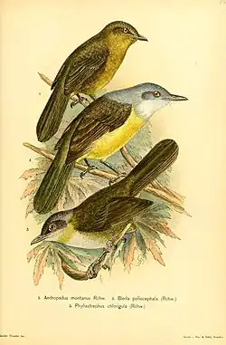 The Cameroon mountain greenbul was originally described in the genus Andropadus and, was re-classified to the new genus Arizelocichla in 2010.[4] Alternatively, some authorities classify the Cameroon greenbul in the genus Pycnonotus. Alternate names for the Cameroon mountain greenbul include Cameroon little greenbul, Cameroon montane greenbul, montane greenbul and mountain little greenbul. The alternate names mountain bulbul and mountain greenbul should not be confused with the species of the same name (Ixos mcclellandii and Arizelocichla nigriceps respectively).
