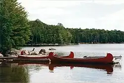 A number of boating PCAs are offered with instruction accredited by the Ontario Recreational Canoeing and Kayaking Association.[18] All residential campers are guaranteed to participate in a canoe trip and spend at least one night in a tent away from the camp grounds. For the trips on Koshlong Lake, the counsellor chooses one of ten camp sites that are sufficiently far from cottages and other distractions.[19] Even though Wanakita does not use it for overnight camping,[8] one of the most popular destinations is Jumper's Rock,( or as cottage renters call it Echo Rock where your echo can be heard high atop Jumpers Rock)) a cliff located 6 metres above deep water.[20] Cabins carry out the tripping in standard canoes that hold four people but Wanakita also has two war canoes holding ten.