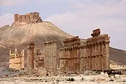 The area known today as the Camp of Diocletian was a group of buildings that spanned an area of 4 hectares (9.9 acres) in an enclosure in the western end of the city.[1] It was built on a hill separated from the town proper by a small wall. The hill was located at the far end of the city's Grand Colonnade from the Temple of Bel. The complex was laid out around two colonnaded streets, the via praetoria and the via principalis, that intersected at right angles at a tetrapylon. The via praetoria axis started at the Praetorian Gate and led to the top of the hill where the principia, or the military headquarters, was built. Within the principia, and located at the highest point in the complex was the so-called "temple of the standards," where the legion's standards were probably kept.[3]