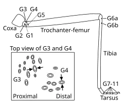 On the legs, groups of campaniform sensilla are located close to the joints on all segments except for the coxa (see leg schematic), with most sensilla located on the proximal trochanter.[10] The number and location of sensilla on the legs varies little across individuals of the same species,[7] and homologous groups of sensilla can be found across species.[10]