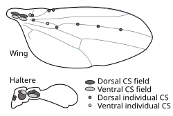 In Diptera such as Drosophila, the highest density of campaniform sensilla is found at the base of the modified hind-wings, the halteres (see haltere schematic).[7][8]