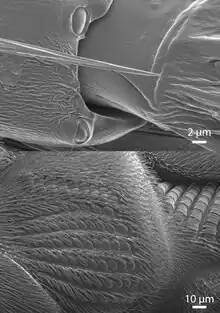 Campaniform sensilla are a class of mechanoreceptors found in insects, which respond to local stress and strain within the animal's cuticle. Campaniform sensilla function as proprioceptors that detect mechanical load as resistance to muscle contraction,[1][2] similar to mammalian Golgi tendon organs.[3][4] Sensory feedback from campaniform sensilla is integrated in the control of posture and locomotion.[5][6]