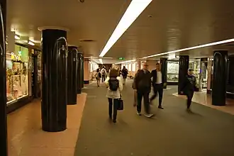 Since construction it has always been a shopping arcade. Before the City Loop distributed passengers to Melbourne's other train stations the arcade was far busier, though around 70,000 commuters still pass through of a morning.[1] The pedestrian thoroughfare includes a bar, a coffee shop, hairdressers and a record store. Between 1994 and 2015 artworks were also displayed by the resident Platform Artists Group.[3] This has since been taken over by The Dirty Dozen, an initiative of City of Melbourne's Creative Spaces. The arcade was also the former home of beloved Indie jewellery shop Corky Saint Clair, which has since moved to Swanston Street, Melbourne.[4]