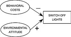The Campbell paradigm suggests that behavior (e.g., switching off lights when leaving a room) is typically the result of two factors: a person's commitment to fighting climate change and protecting the environment (i.e., a person's environmental attitude) and the costs that come with a specific behavior (e.g., having to remember to switch off the lights; see Fig. 1). The paradigm stands in contrast to the widespread rational choice theories, whose prototype is the theory of planned behavior in psychology. Rational choice theories explain behavior through a behavior's expected utility.[3]