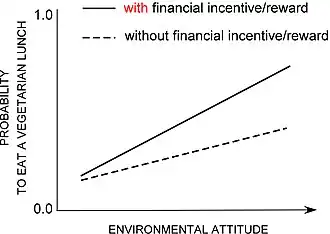 The literature contains a considerable number of (sometimes contradictory) conjunctive behavioral explanations[29] that speak of the cost-moderated efficacy of people's attitudes (see Fig. 2a).[30][31][32][33] By contrast, the Campbell Paradigm suggests that behavioral costs are unrestrictedly behaviorally effective and independent of people's attitude levels (see Fig. 2b). In other words, financial rewards make vegetarian lunches more probable for everyone.[34] This countervailing relationship between behavioral costs and attitude has been repeatedly quasi-experimentally confirmed in environmental protection research.[35][36][37]