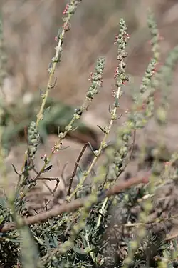Camphorosma is a genus of flowering plants in the family Amaranthaceae,[3][4] found in northern Africa, southern and eastern Europe, Crimea, Russia, Anatolia, the Caucasus, Iran, Afghanistan, Pakistan, Central Asia, the Altai, western Siberia, Xinjiang in China, and Mongolia.[2] Annuals or subshrubs, they can be distinguished from closely related taxa such as Bassia by their flattened perianths which have four lobes, inflorescences with multicellular glandular hairs, a distinct C4 leaf anatomy type (called the Camphorosma type), and a chromosome count of 2n = 12.[5][6]