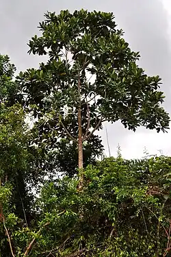 Campnosperma auriculatum is a rainforest tree in the family Anacardiaceae native to the East Indies and Southeast Asia.[1][2] The sapling tree has very large leaves up to 1.8 metres (6 feet) long by up to 37 centimetres (15 inches) wide[3][4] with wavey margins. The leaves of mature trees are oblanceolate and about 75 centimetres (30 inches) long, forming a tight circle at the ends of the branches. The flowers are yellowish, in small panicles, forming reddish berries upon pollination.