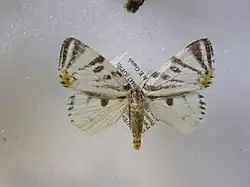 Adults have white wings with a series of dark grey stripes and spots, and the pale yellow forewing tornus.[2]