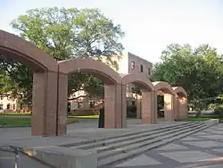 Facilities for the Corps of Cadets are located in the Quadrangle, or "The Quad", an area consisting of dormitories, Duncan Dining Hall, and the Corps training fields.[66] The Corps Arches, a series of 12 arches that "[symbolize] the undying spirit of the 12th Man of Texas A&M", mark the entrance to the Quadrangle.[67] All cadets, except those who are married or who have had previous military service, must live in the Quad with assigned roommates from the same unit and graduating class. Reveille, the Aggie mascot, lives with her handlers in the Quadrangle.[68]
