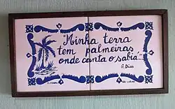 | Minha terra tem palmeiras Nosso céu tem mais estrelas, Em cismar, sozinho, à noite, Minha terra tem primores Não permita Deus que eu morra | My land has palm trees Our skies have more stars, In dreaming, alone, at night, My land has beauties May God never allow |