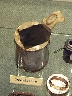 The twist-key style was patented by J. Osterhoudt in 1866.[6] Each can produced for its use came with a soldered-on twist-key, which snapped off after fatiguing its attachment point by bending back-and-forth. Different food types came in their own style and shape of can, each with a corresponding twist-key. Tinned fish (such as sardines) were sold in flat rectangular cans. A twist-key would be inserted into a fold out tab, then rolled around the top of the can peeling back a pre-scored strip of metal.[7] Coffee,[8] beans, and most other types of meat, were packaged in cylinders, with appropriate sized keys that operated in the same manner.[9]