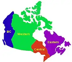 The CUC is made up of 43 member congregations and emerging groups,[6] who are the legal owners of the organization, and who are, for governance and service delivery, divided into four regions: "BC" (British Columbia), "Western" (Alberta to Thunder Bay), "Central" (between Thunder Bay and Kingston), and "Eastern" (Kingston, Ottawa and everything east of that).[7] However, for youth ministry, the "Central" and "Eastern" regions are combined to form a youth region known as "QuOM" (Quebec, Ontario and the Maritimes), giving the youth only three regions for their activities.[8] The organization as a whole is governed by the CUC Board of Trustees (Board),[9] whose mandate it is to govern in the best interests of the CUC's owners. The Board is made up of eight members who are elected by congregational delegates at the CUC's Annual General Meeting. This consists of two Trustees from each region, who are eligible to serve a maximum of two three-year terms. Board meetings also include Official Observers to the Board, who participate without a vote and represent UU Youth and Ministers.