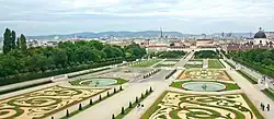 The original veduta, which serves as the blueprint for this view, depicts Vienna in either 1759 or 1760 on a hot summer day with high society mingling in the shade of a green wall separating the gardens.[1] The domes of Karlskirche, St. Stephen's Cathedral tower, and the dome of the Salesian Nuns' Church serve as vertical landmarks. The foreground shows the gardens of the Belvedere Palace. Other prominent landmarks visible in Bellotto's oil painting that still exist today are the Schwarzenberg Palace and the Lower Belvedere Palace.[1]