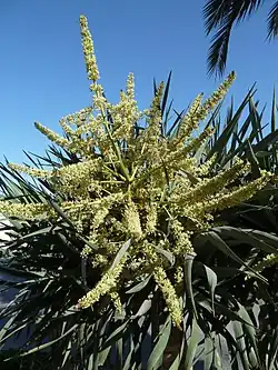 Dracaena draco is an evergreen long lived tree capable of exceeding 15 m (49 ft) in height and having a trunk of 5 m (16 ft) or more in circumference, starting with a smooth bark that evolves to a more rough texture as it ages.[8] The "dragon tree" is a Monocot, with a branching growth pattern currently placed in the asparagus family (Asparagaceae, subfamily Nolinoidae).[9] When young it has a single stem. At about 10–15 years of age the stem stops growing and produces a flower spike with white, lily-like perfumed flowers, followed by coral berries. Soon a crown of terminal buds appears and the plant starts branching. Each branch grows for about 10–15 years and re-branches, so that a mature plant has an umbrella-like habit. It grows slowly, requiring about 10 years to reach 1.2 metres (4 ft) in height, but at times, grows much faster.[10]