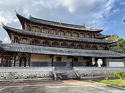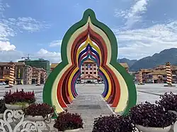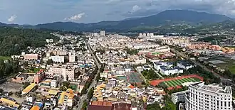 Cityscape of county town Monihei Square Hulu Lake Park Banlao Stupa Om Din village Cangyuan Sinkhole | |