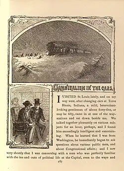 "Cannibalism in the Cars" is a short story written in 1868 by American writer Mark Twain. It tells the darkly humorous tale of apparent acts of cannibalism from the point of view of a congressman on a snowbound train. It indirectly satirizes the political system of the United States.