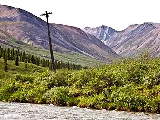 Major river crossings include the third and fourth crossings of the Ekwi, the Twitya, the Little Keele and the second crossing of the Carcajou. Depending on water levels these can be difficult or impossible to cross on foot. There are also many smaller creek and river crossings that may be difficult at high water. A hiker died in 2016 after being swept away crossing the Little Keele.[3] In 2016 a seasonal cable ferry system was tested to provide a safer crossing of the Twitya,[4] however it has not been reinstalled.