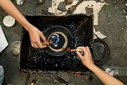 Firstly, the cloth must be washed, soaked and beaten with a large mallet. The hot and liquid wax is scooped from small wajan (wok) heated upon small stove. The batik craftsperson sometimes blow the spout tip of canting to allow the liquid wax to flow smoothly and to avoid clogging, then they draw the line or dot upon the cloth, applying the liquid wax, following the patterns and images that previously had been drawn using pencil.[16] A pattern is then drawn with hot wax called malam using canting. The wax functions as a dye-resist. After this, the cloth is dipped in a dye bath containing the first colour. After the cloth is dry, the wax is removed by scraping or boiling the cloth. This process is repeated as many times as the number of colours desired. For larger areas of cloth which need to be covered, the wax is applied using a tool called nemboki/mopoki.[17]