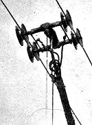 The power supply differed from those in other countries in that, as a collector, a four-wheeled truck ran underneath the wires, held in place by a trolley pole in the usual manner. The possible deviation on either side of the direct route was 10–12 feet (3.0 to 3.5 m). The cars were usually equipped with two 15-horsepower (11 kW) motors and had a carrying capacity of 20 to 24 passengers.[1] Its design and construction have been so perfected that it would take easily very sharp curves, and would not leave the trolley wires even when running at a speed of 18 miles per hour (29 km/h). They could master larger grades than trams, it was claimed.[2] The overhead wires had a diameter of 3⁄8 inch (9.5 mm) for 600 Volt direct current and could be used in both directions. The drivers stood upright in a cab similar to that of a tram.