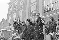 Most significantly, newspapers reported that Muskie cried openly.[18][19] David S. Broder of The Washington Post had it that Muskie "broke down three times in as many minutes".[20] David Nyhan of The Boston Globe had Muskie "weeping silently".[21][22] James M. Naughton of The New York Times wrote, "The Senator broke into tears minutes later, his speech halting",[23] although in later discussion, Naughton said he could not confirm that Muskie cried.[19] On television in New York City, CBS ran film that appeared to show Muskie crying, while ABC had run out of film during the speech, and NBC said they did not receive any film from the event.[18]