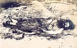 It was eventually determined that Antônio Conselheiro himself had likely died of dysentery on 22 September.[3] Before Canudos was burned down and dynamited, Conselheiro's body was exhumed, the head was removed, and it was "displayed on a pike" to be "held high at the front of a military parade for all to see."[3] According to Peter Robb, it "was taken to the Medical Faculty of Bahia to be studied for abnormalities."[11] When all resistance ceased and "peace" was restored, only 150 survivors remained.