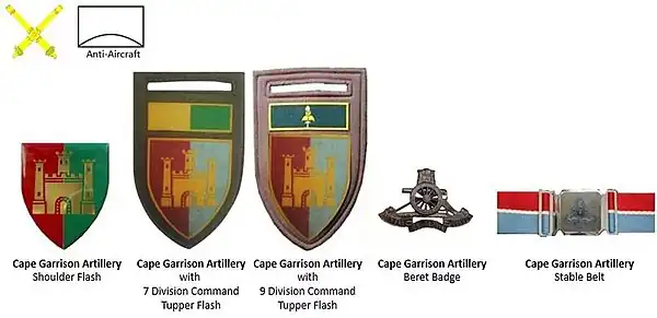 - In the 1950s and 1960s, the current regiment wore the South African Artillery badge - also a field gun, but without the crown – with the coat of arms of the University of Cape Town on the wheel of the gun. Since the 1970s, the badge has been a field gun topped by a three-towered castle.