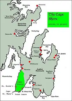 Often confused or conflated with the Southern Shore (a rural district with strong Irish-Newfoundland heritage stretching south from St. John's to Trepassey), the Cape Shore is similarly rural and populated by Irish Newfoundlanders, but is geographically distinct. It is named for Cape St. Mary's, the southeastern tip of Placentia Bay, celebrated in the famous Newfoundland ballad Let Me Fish Off Cape St. Mary's.