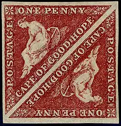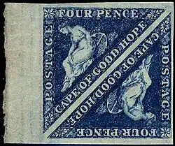 Stamps were first issued by the colony on 1 September 1853. The two stamps that were issued were a one penny in brick-red and a four pence in blue. The unusual shape of the stamps was probably inspired by the large triangular obliterator used by the Cape Revenue Department from 1839. The stamps were printed by Messrs Perkins, Bacon & Co in London. The original die for these stamps was cut by William Humphrys, an engraver employed by Perkins Bacon.[4][5][6] Sheets of a special handmade paper, measuring 282 mm by 536 mm, were used to print 240 stamps per sheet. The stamps were issued imperforate, like the early British stamps, meaning that postmasters had to use scissors or a knife to separate them. The rate of postage within the colony was 4d for a half ounce letter and 1d for a newspaper.[4]