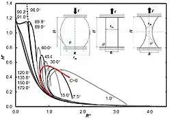 where , dimensionless radius at the contact is and θ is the contact angle. The relation shows that capillary pressure can be positive or negative. The shape of capillary bridges is governed by the equation:[2]